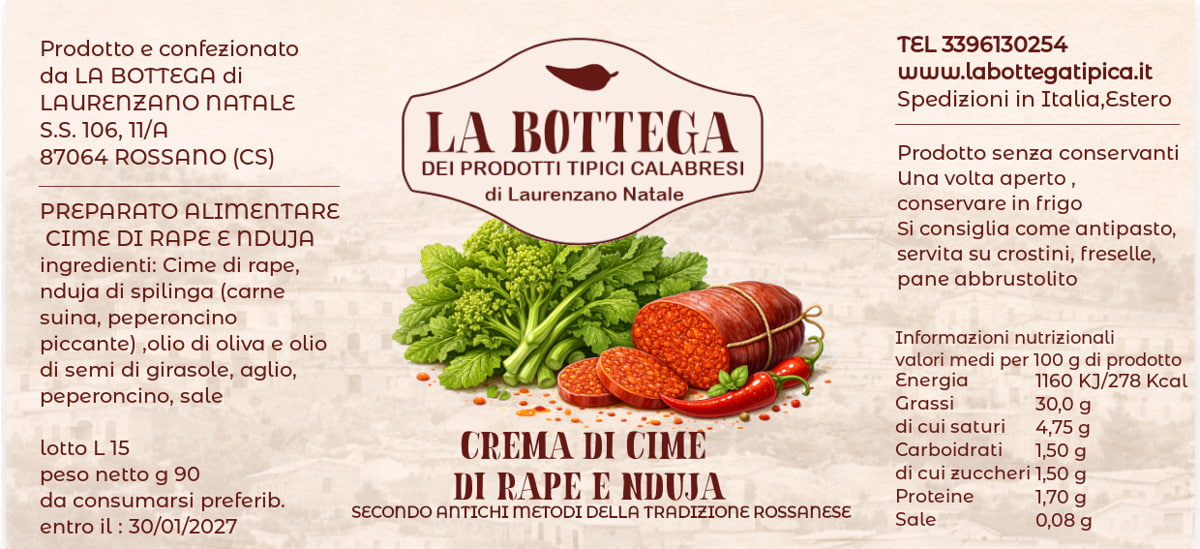 Macinatura granulare di cime di rape coltivate in Calabria con l'aggiunta di Nduja calabrese , aromi naturali e olio di oliva, per condire primi e da spalmare sul pane, ideale per aperitivi, antipasti e contorni. Ideale per creare sfiziosi stuzzichini, pizze e focacce.