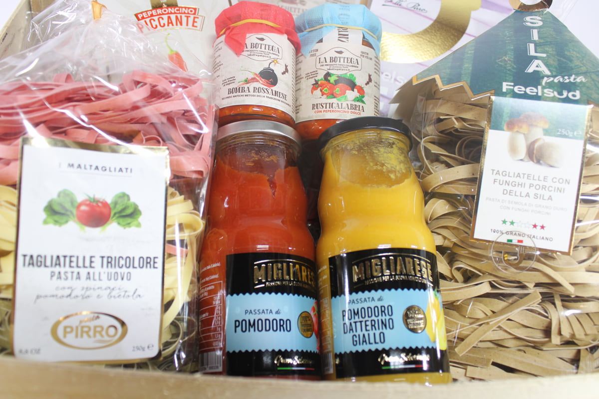 Ogni cesto/confezione è compreso di paglia, foglio trasparente di cellophan e un nastro con coccarda (rossa o dorata)