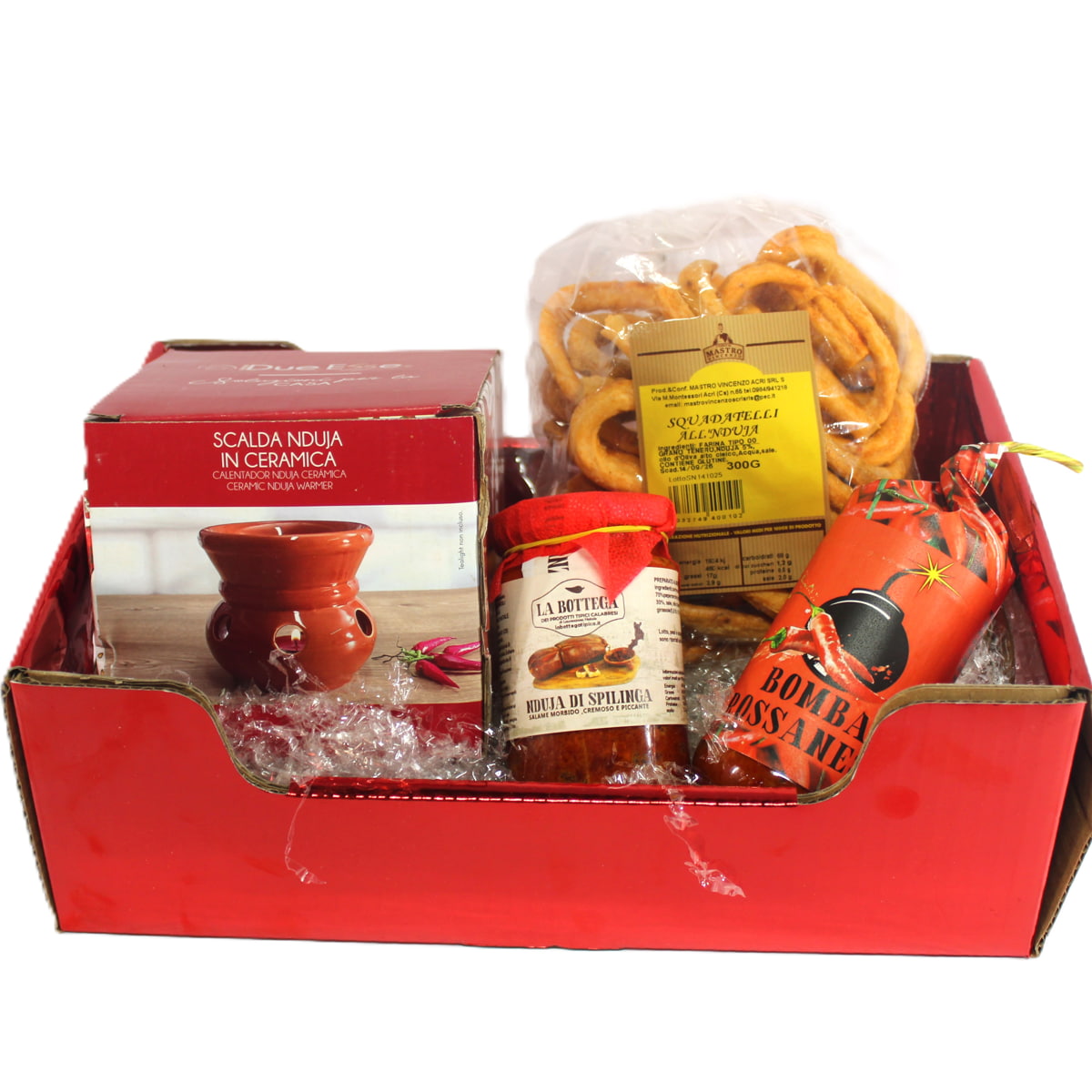 Ogni cesto è compreso di paglia, foglio trasparente di cellophan e un nastro con coccarda (rossa o dorata)