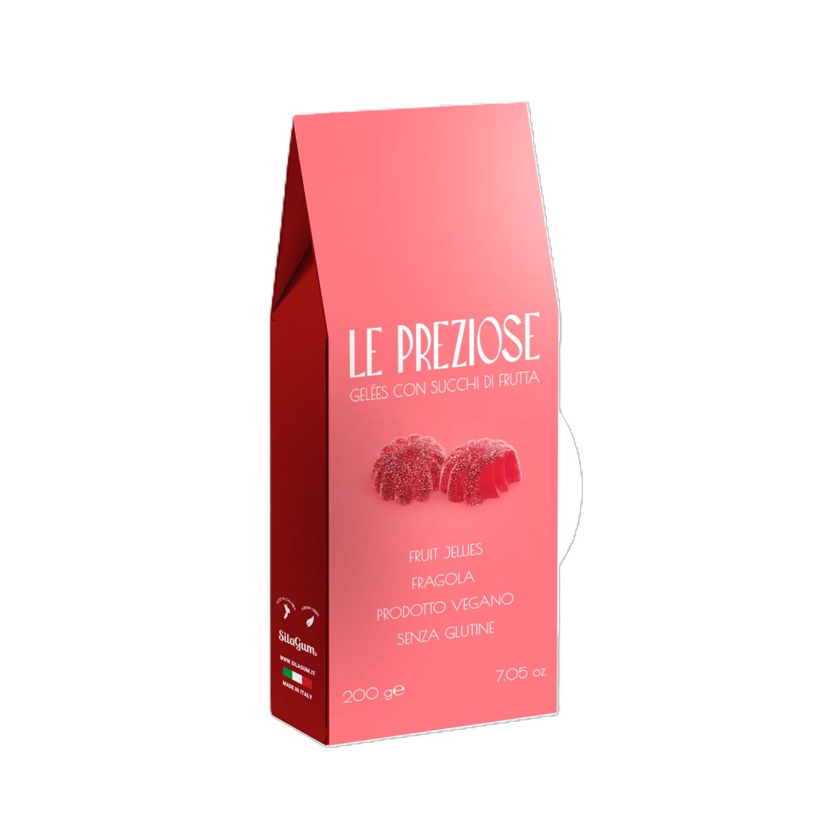 Morbide gelatine con succo di fragola, incartate singolarmente e confezionate in un prezioso astuccio da 200g.