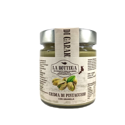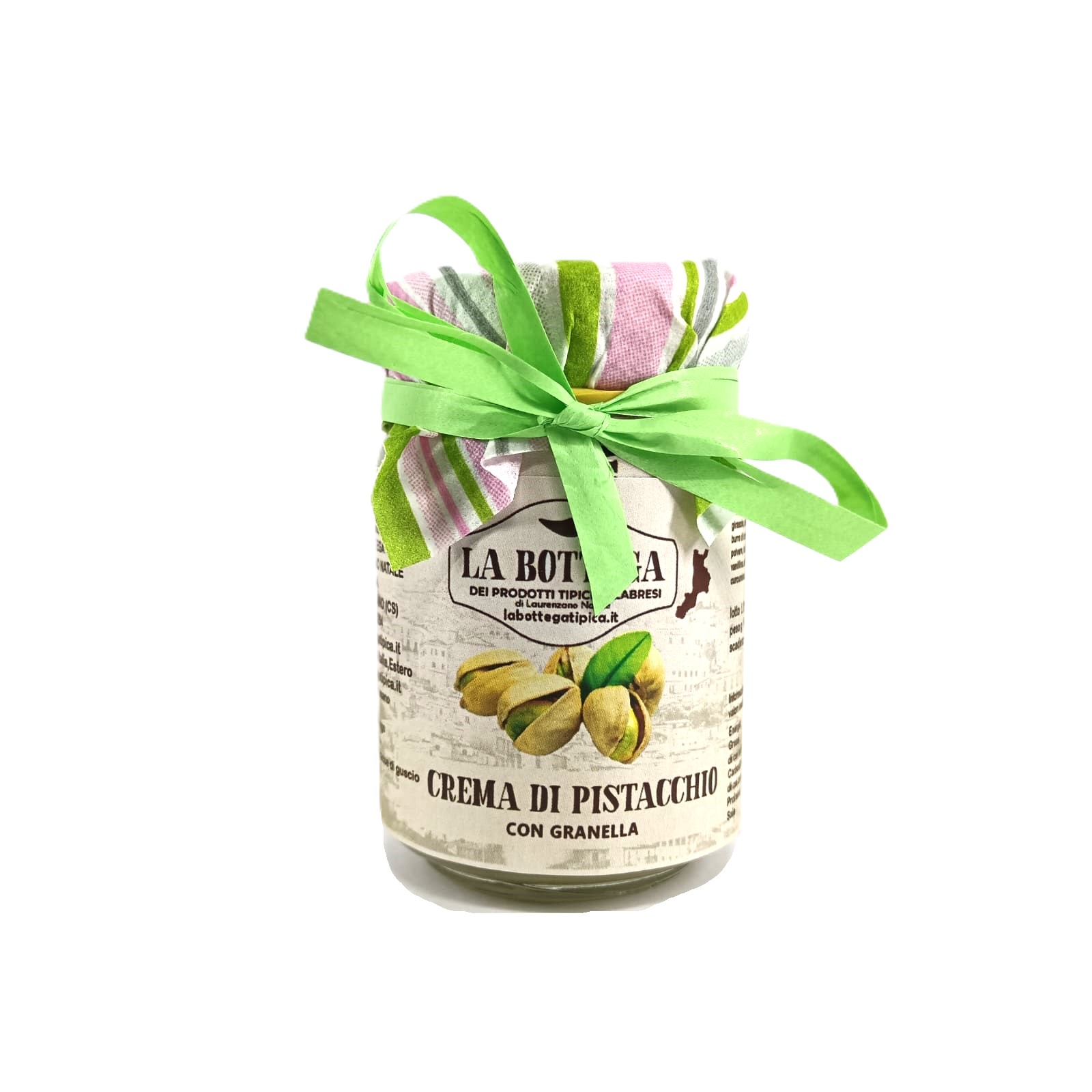 Crema di pistacchio dolce spalmabile con granella di pistacchio, gradevole presenza di scagliette di pistacchio avvolte dalla deliziosa crema dal gusto avvolgente.