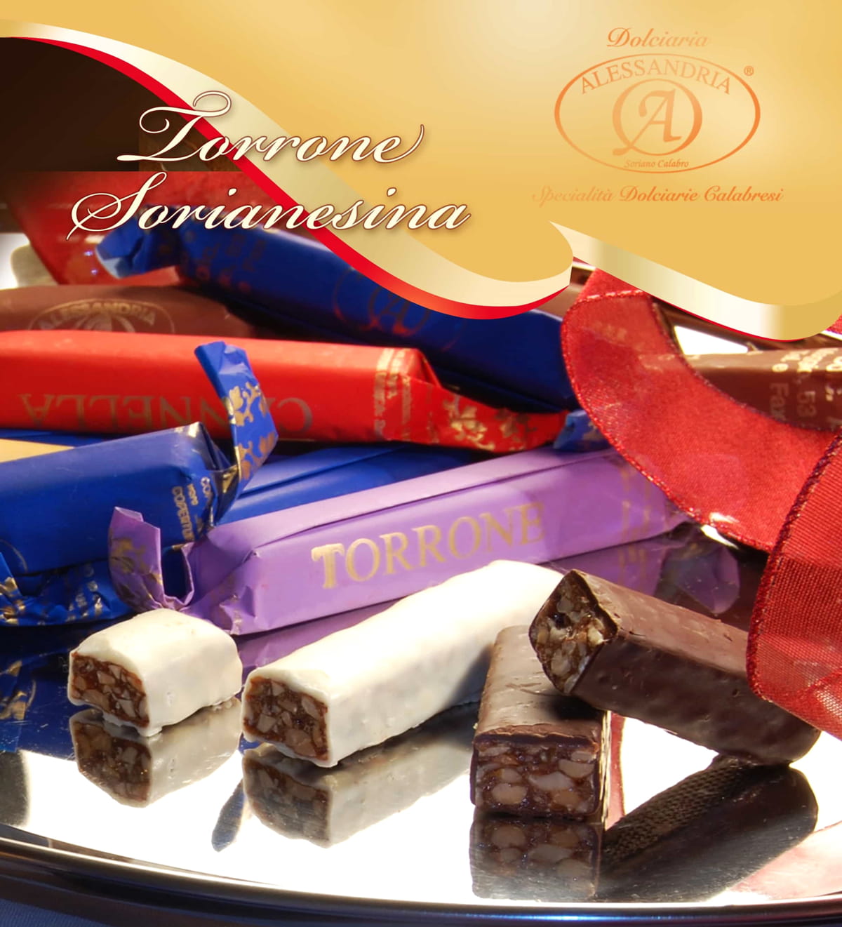Torrone alle arachidi di Soriano (VV) ricoperto di cioccolato nero dal gusto intenso, preparato utilizzando solo ingredienti selezionati.