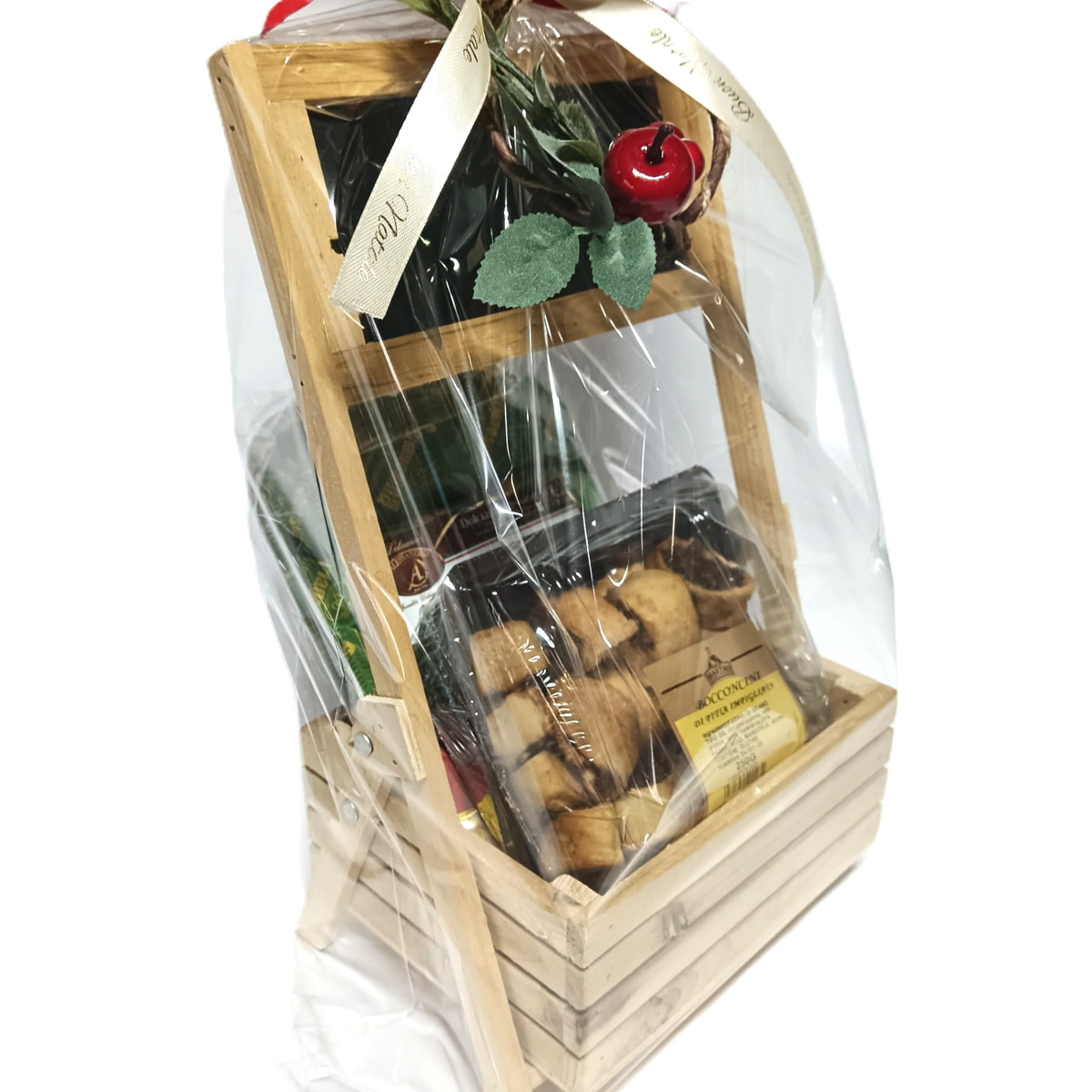 Ogni cesto è compreso di paglia, foglio trasparente di cellophan e un nastro con coccarda (rossa o dorata)