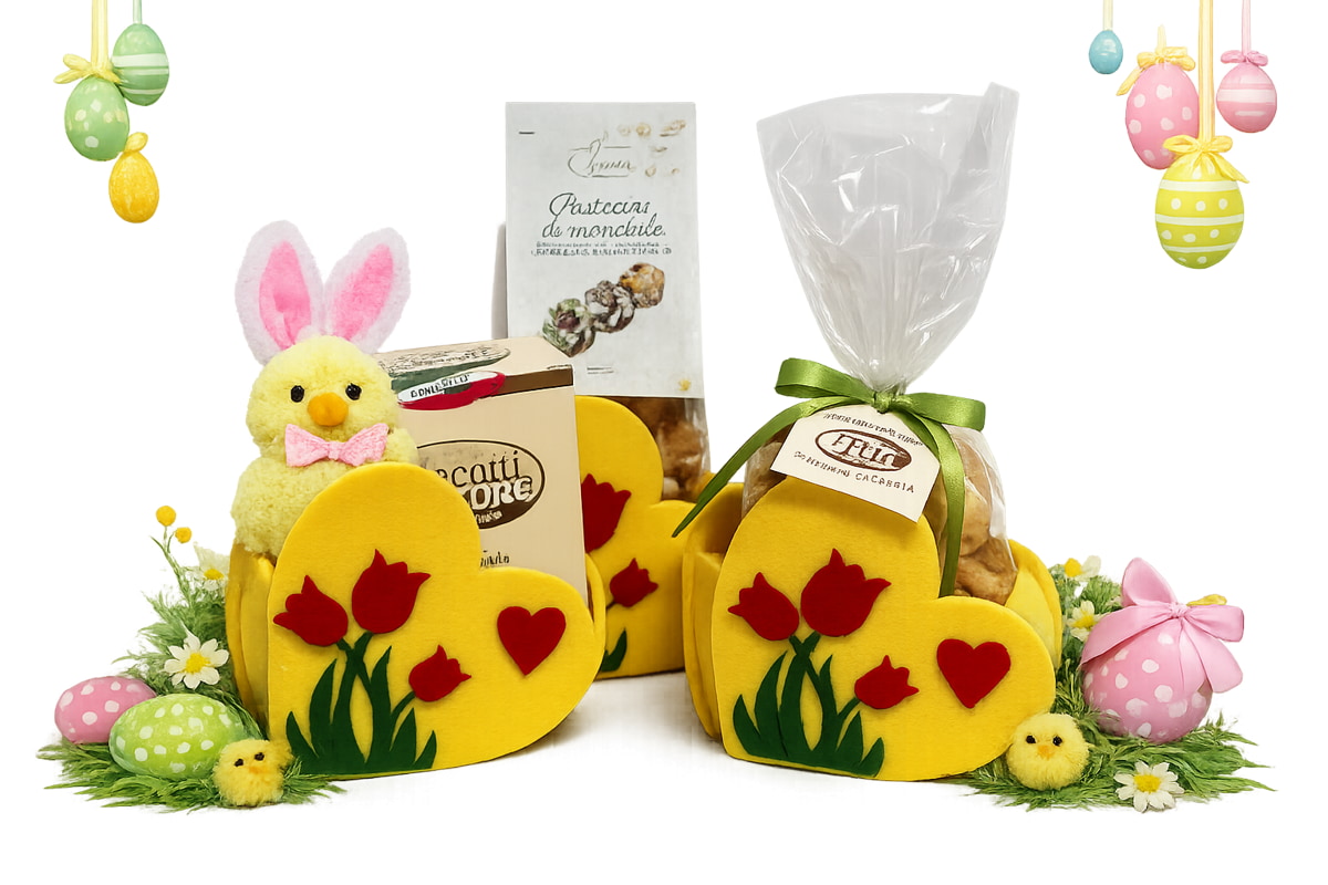 La seguente confezione regalo in feltro giallo e cuoricini rossi puo contenere una confezione di dolci: