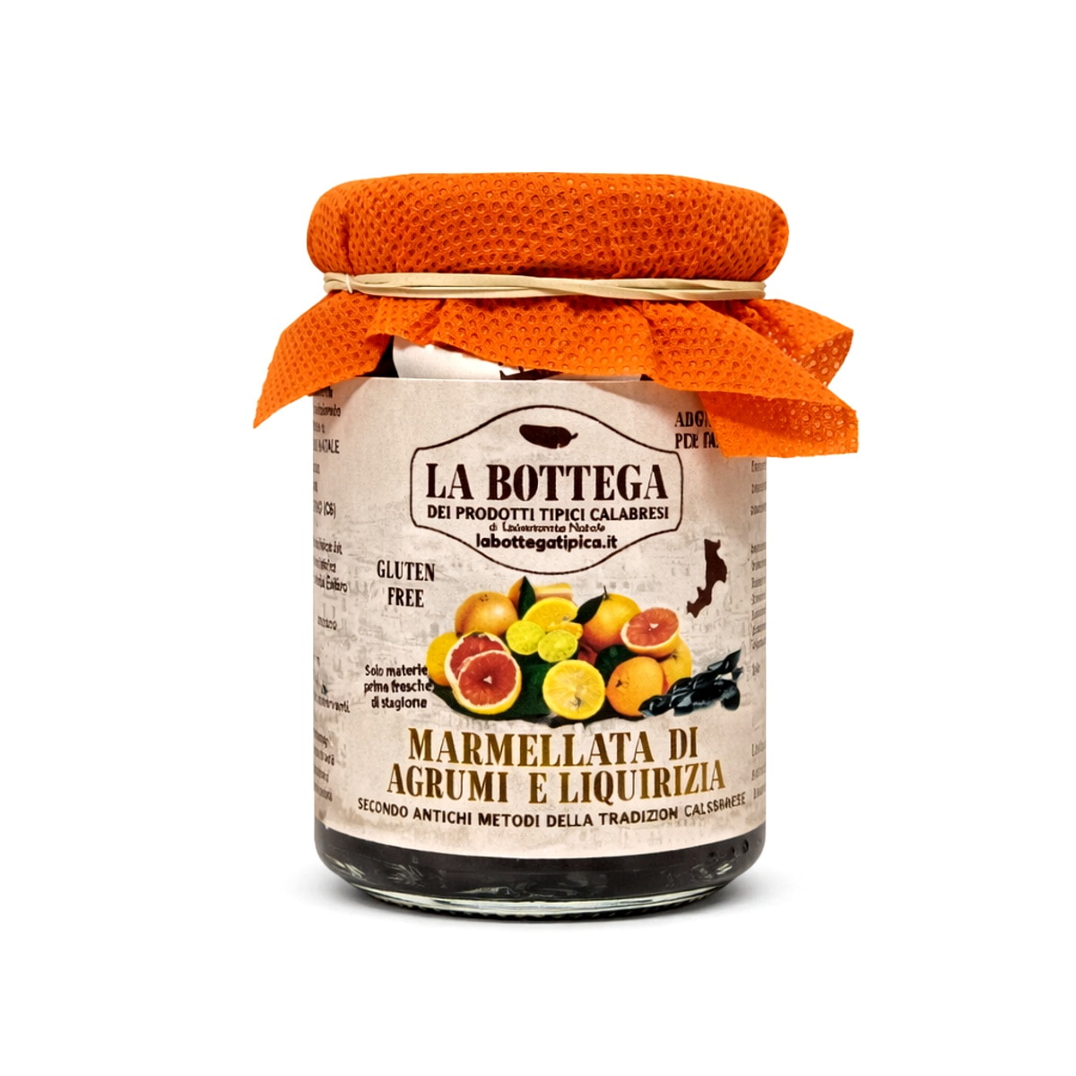 Questa marmellata è composta da un insieme di agrumi, in proporzione variabile, tra arance, bergamotto, cedro , con aggiunta di polvere di liquirizia che ne accentua la freschezza. Consigliato sia come colazione, che sui formaggi freschi o stagionati. Disponibile da 200 gr e 100 gr